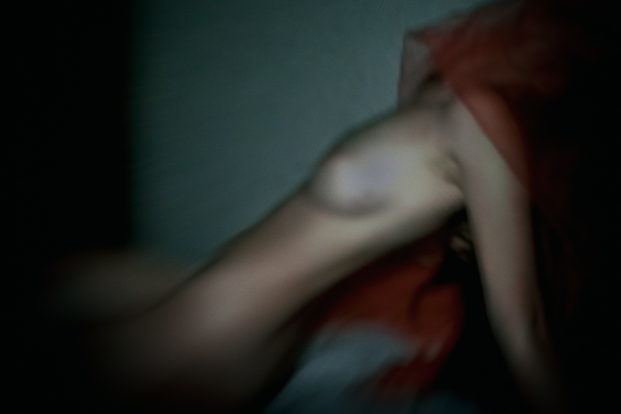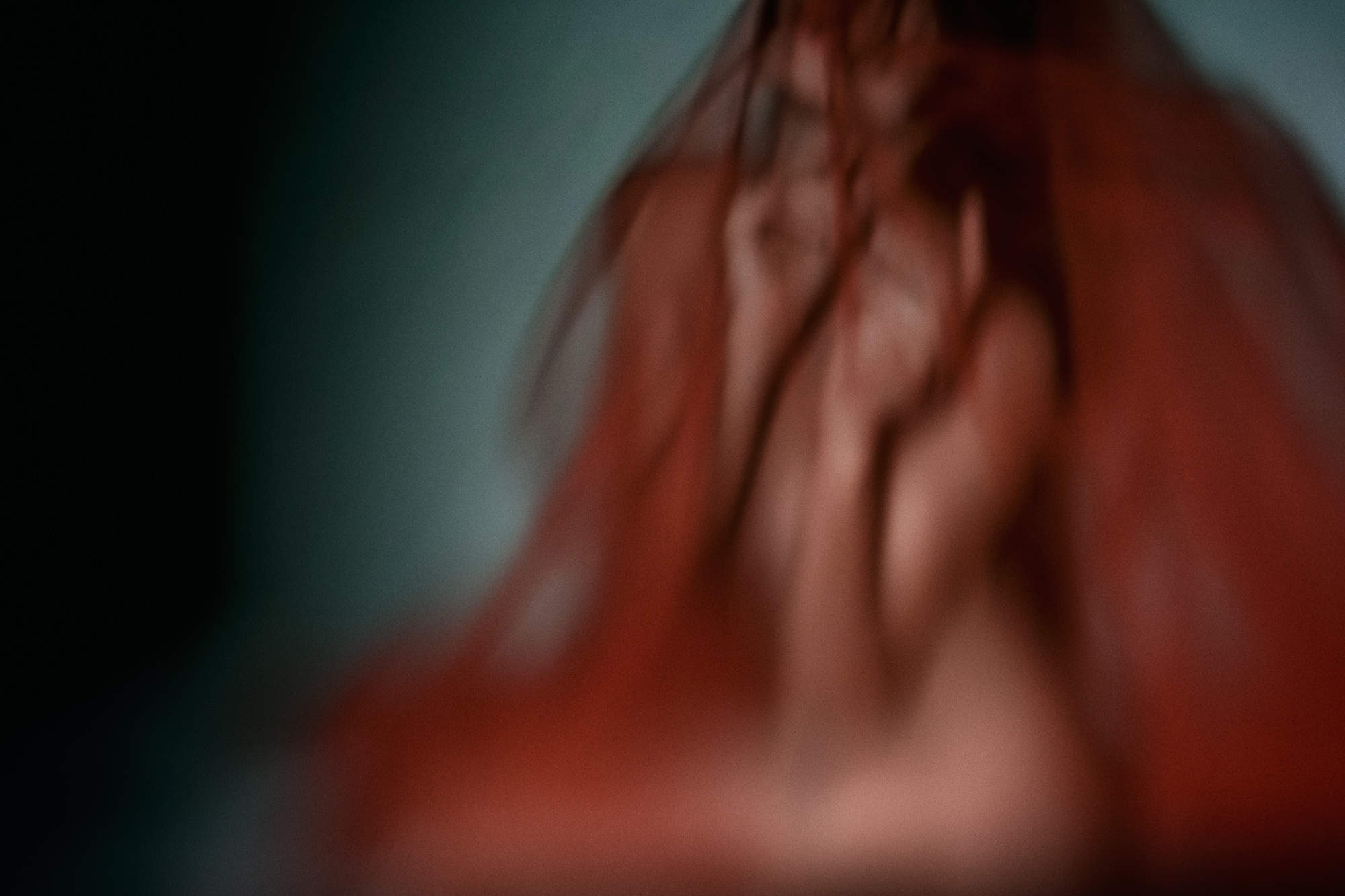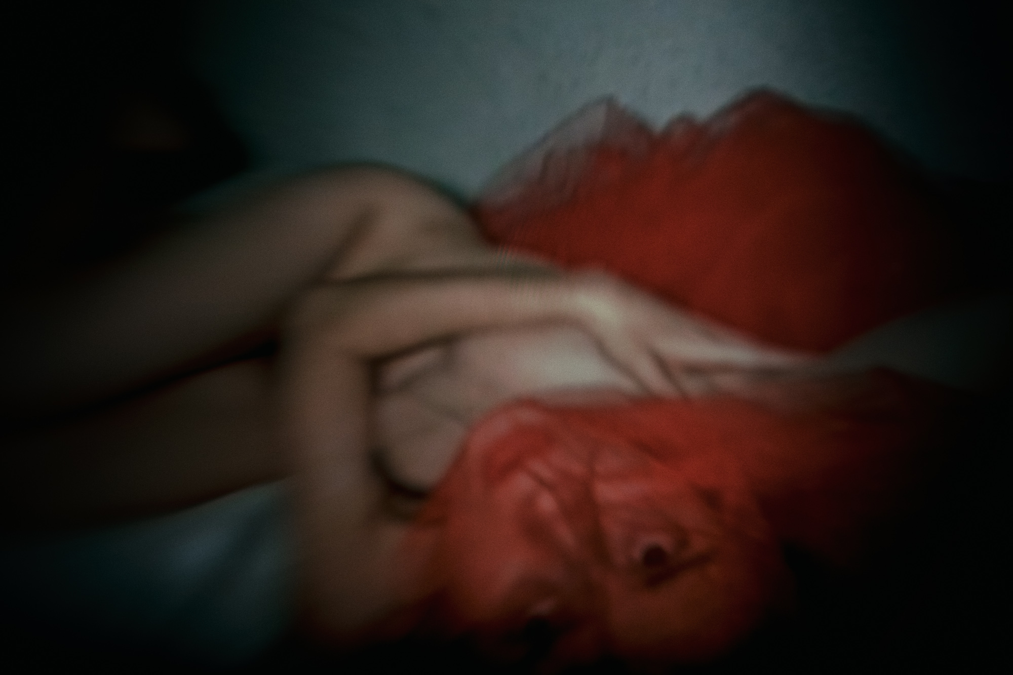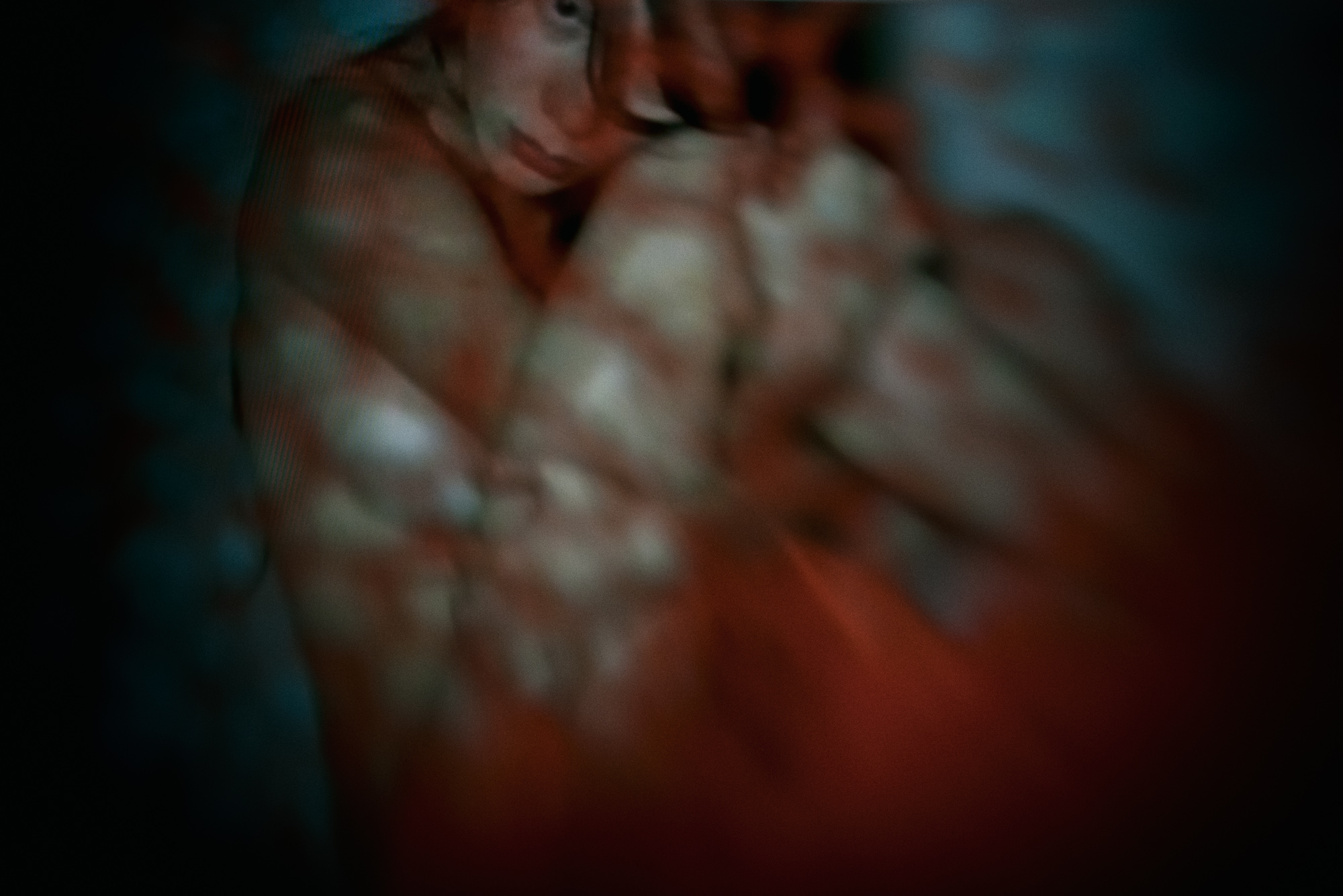 To outline the story: it is about a girl who is trapped at home having bizarre visions of herself. Nightmarish visions resulting from her isolation and born in the liminal space between being awake and asleep. I like the idea of the pictures being stills from a long-forgotten horror or mystery film. I like their expressive and ambiguous quality. The blurriness was created by me using a special lens while capturing the screen. Other effects came through her covering the webcam with semitransparent fabric. I was really surprised how well this worked out. It was a collaborative effort in the best sense.