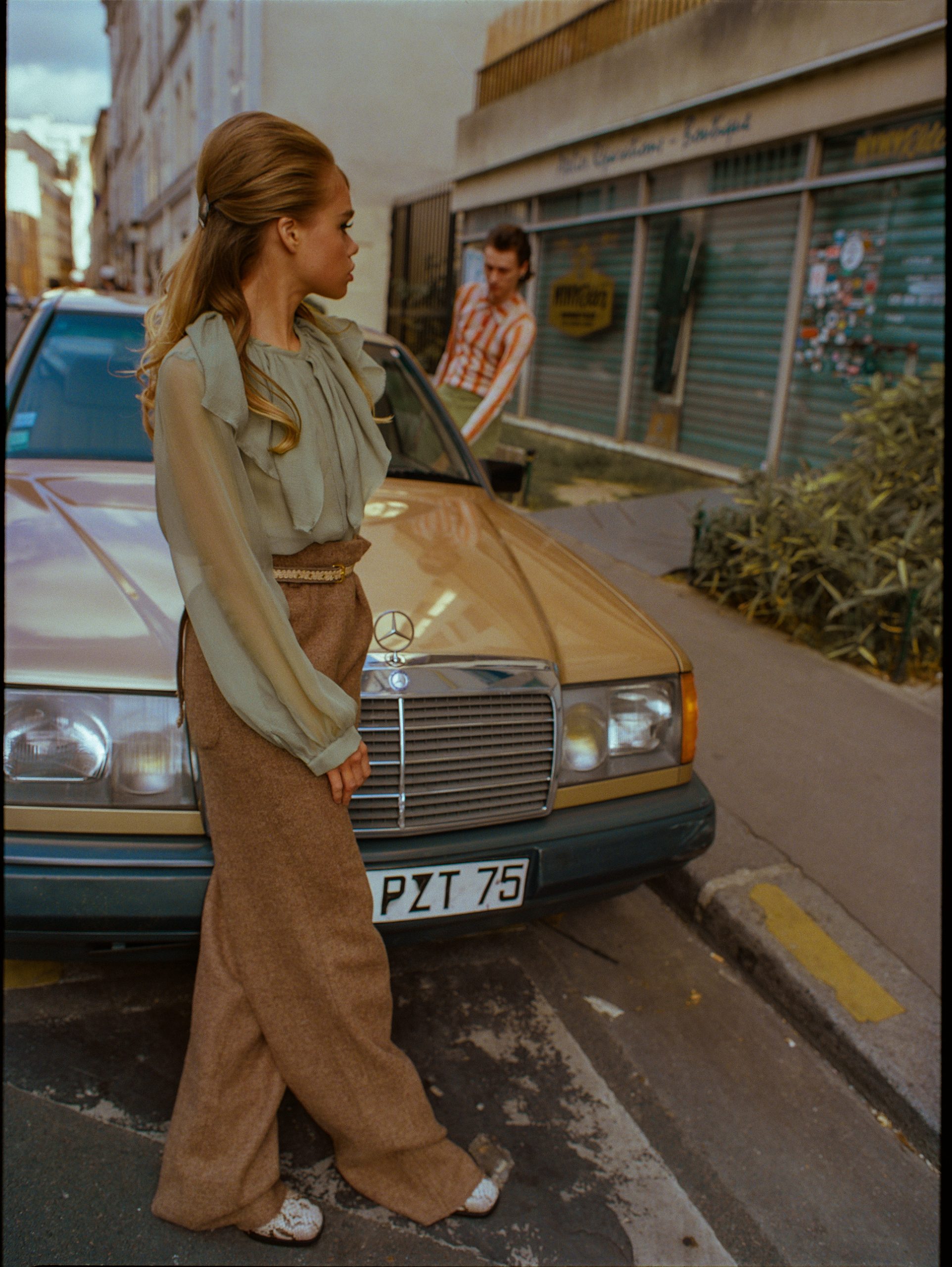 Maya wears : Muslin top, Véronique Leroy Cotton belt, Véronique Leroy Wool trousers, Véronique Leroy Leather boots, Nodaleto