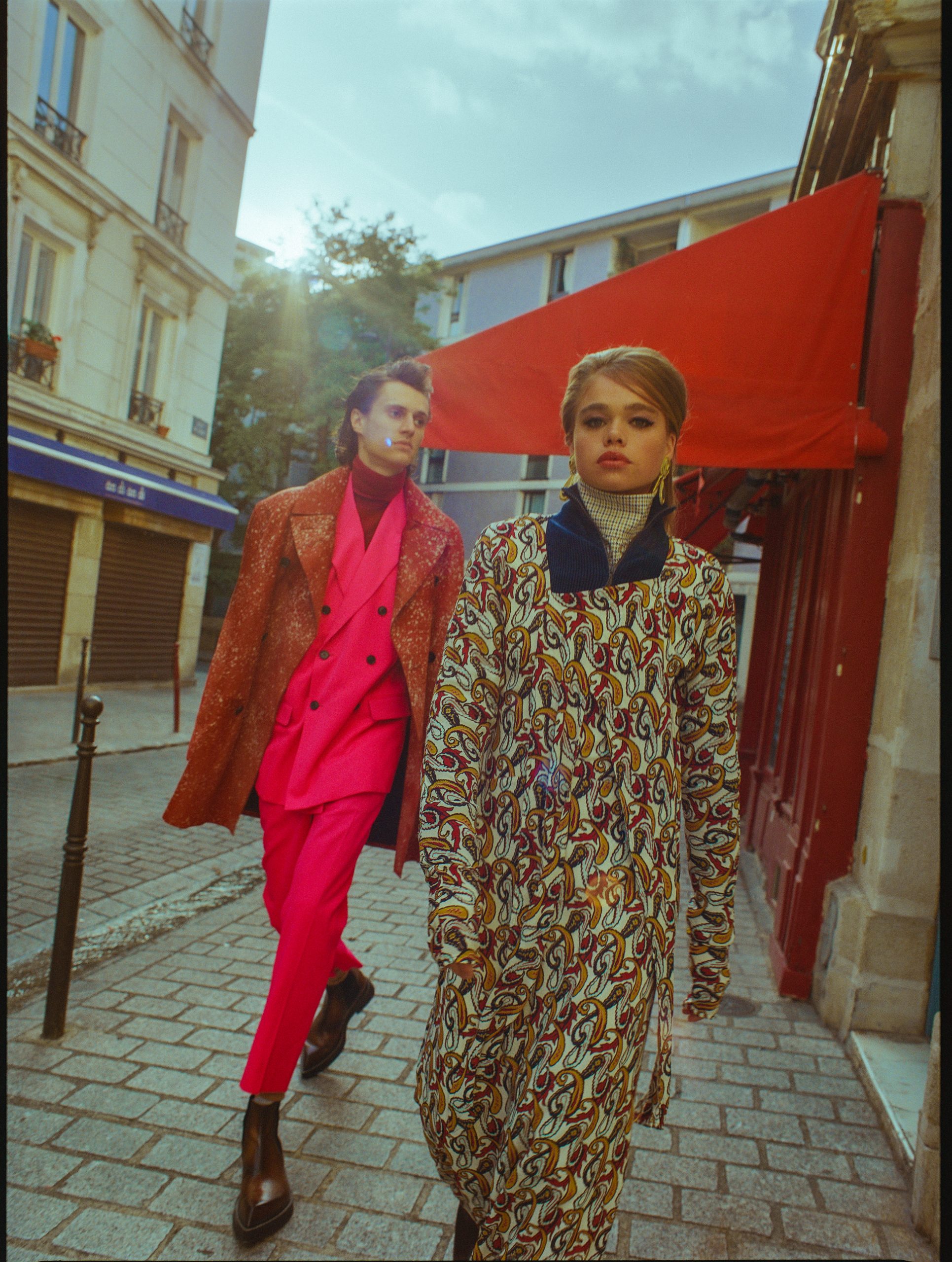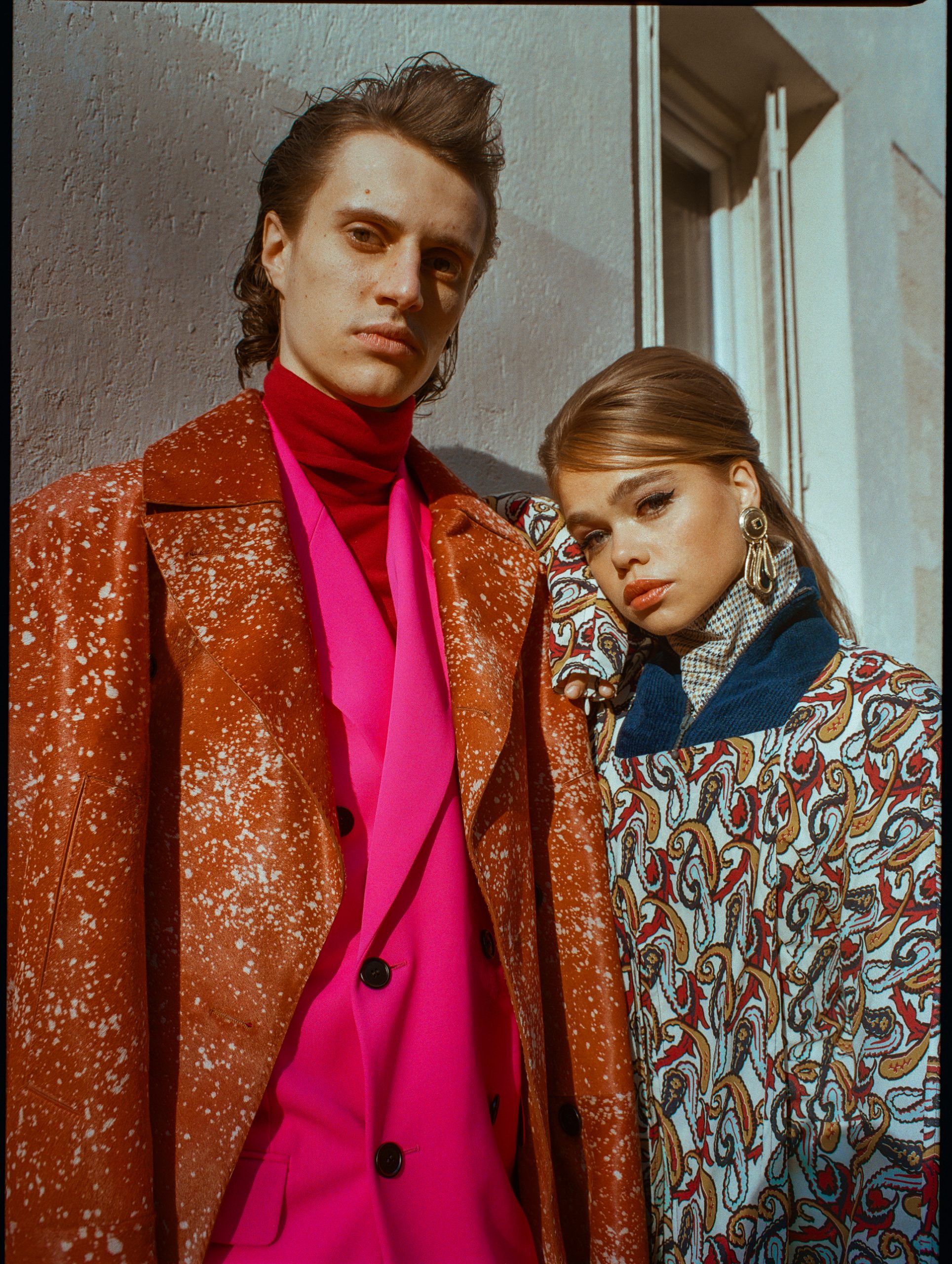 Elliott wears : Wool coat, Maison Kitsuné Silk shirt, Lacoste Leather trousers, MM6 Maison Kitsuné