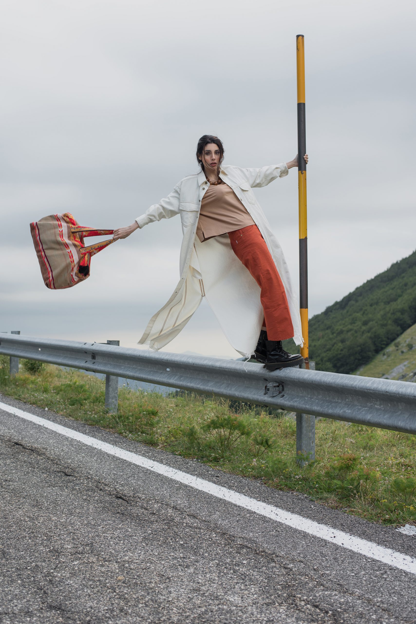 long white jacket: Erica Cavallini , t-shirt: semicouture, pant: True NYC, bag: forte forte and boots: dr. Martens