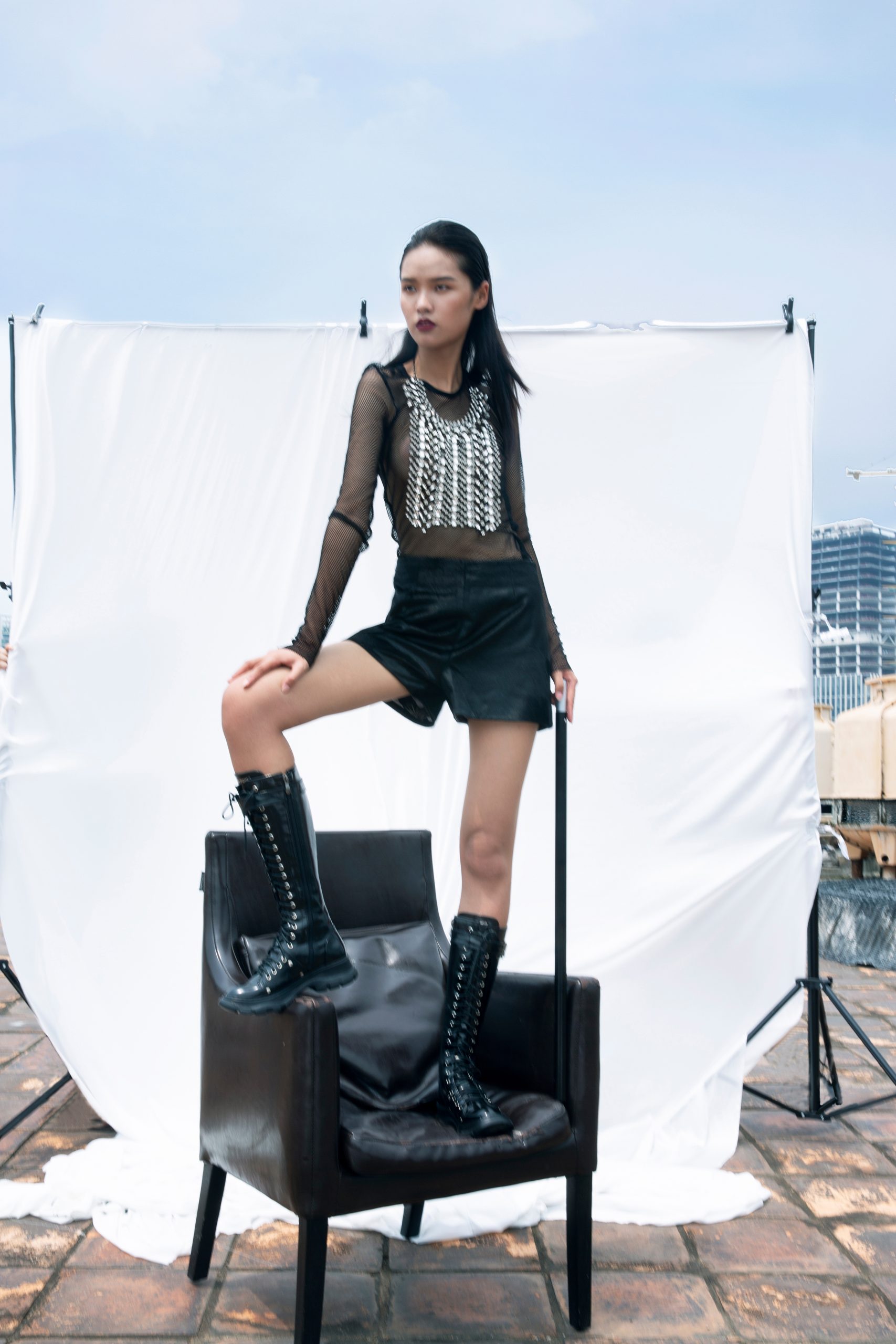 T-shirt, Zara; shorts, GH; Vest, stylists own; Boots, Alexander McQueen