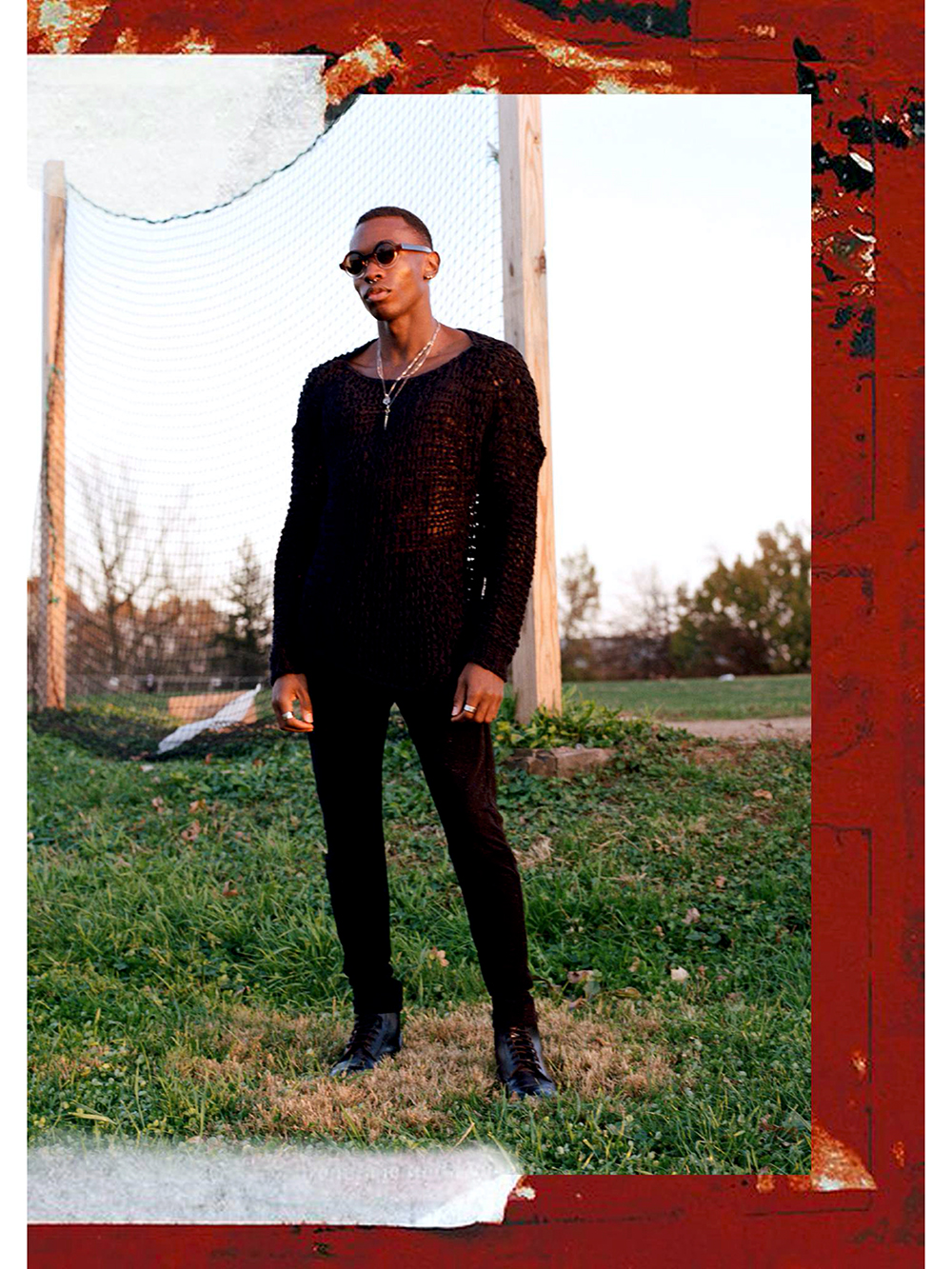 Knitwear Helmut Lang, trousers Apesi, boots Dr. Martens, sunglasses Cutler and Gross and jewelry model’s own.