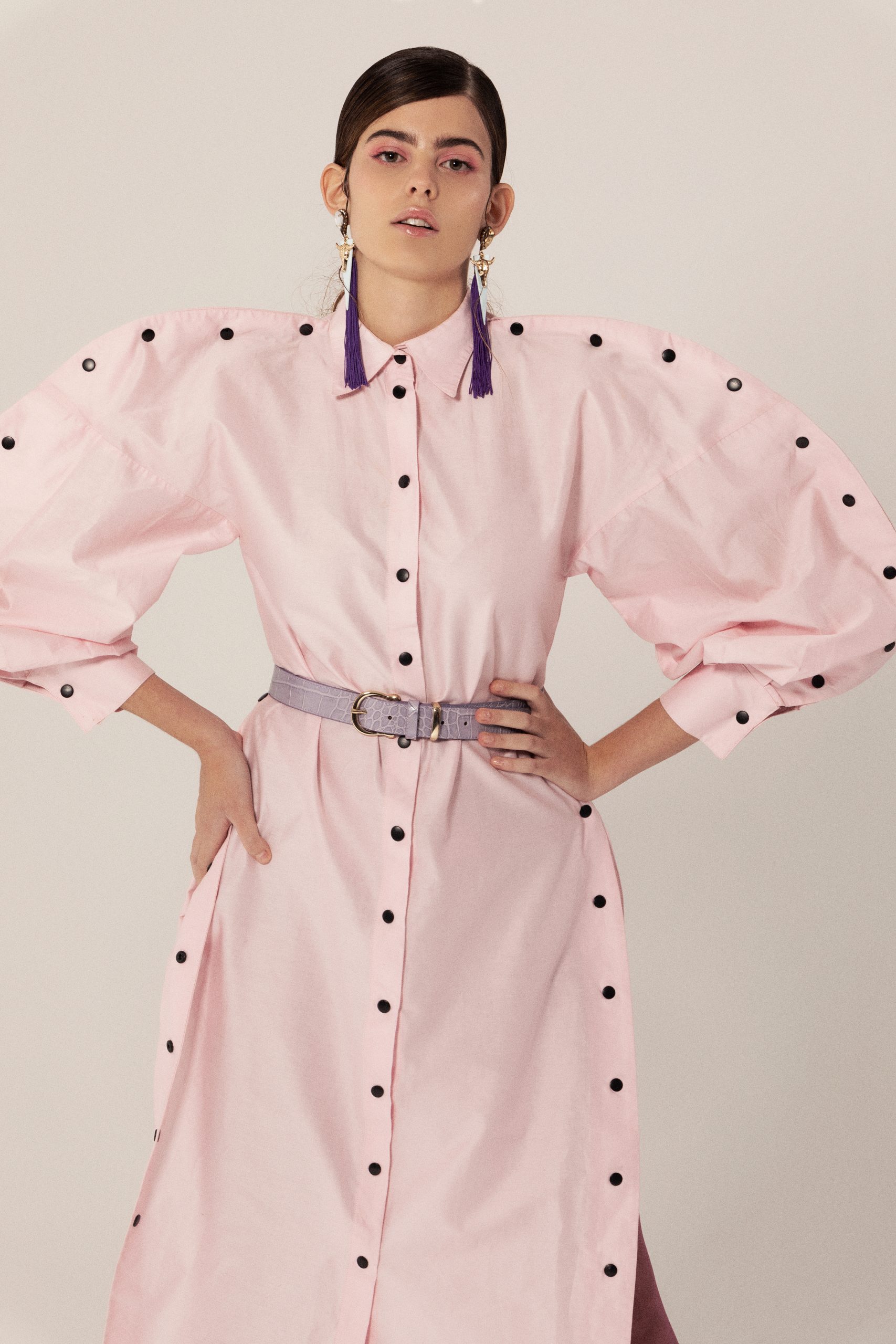 Paula; Dress: Luis Pacheco; Earring: kiwipomelo; Belt: & Others Stories; Pantyhose: Cecilia de Rafael