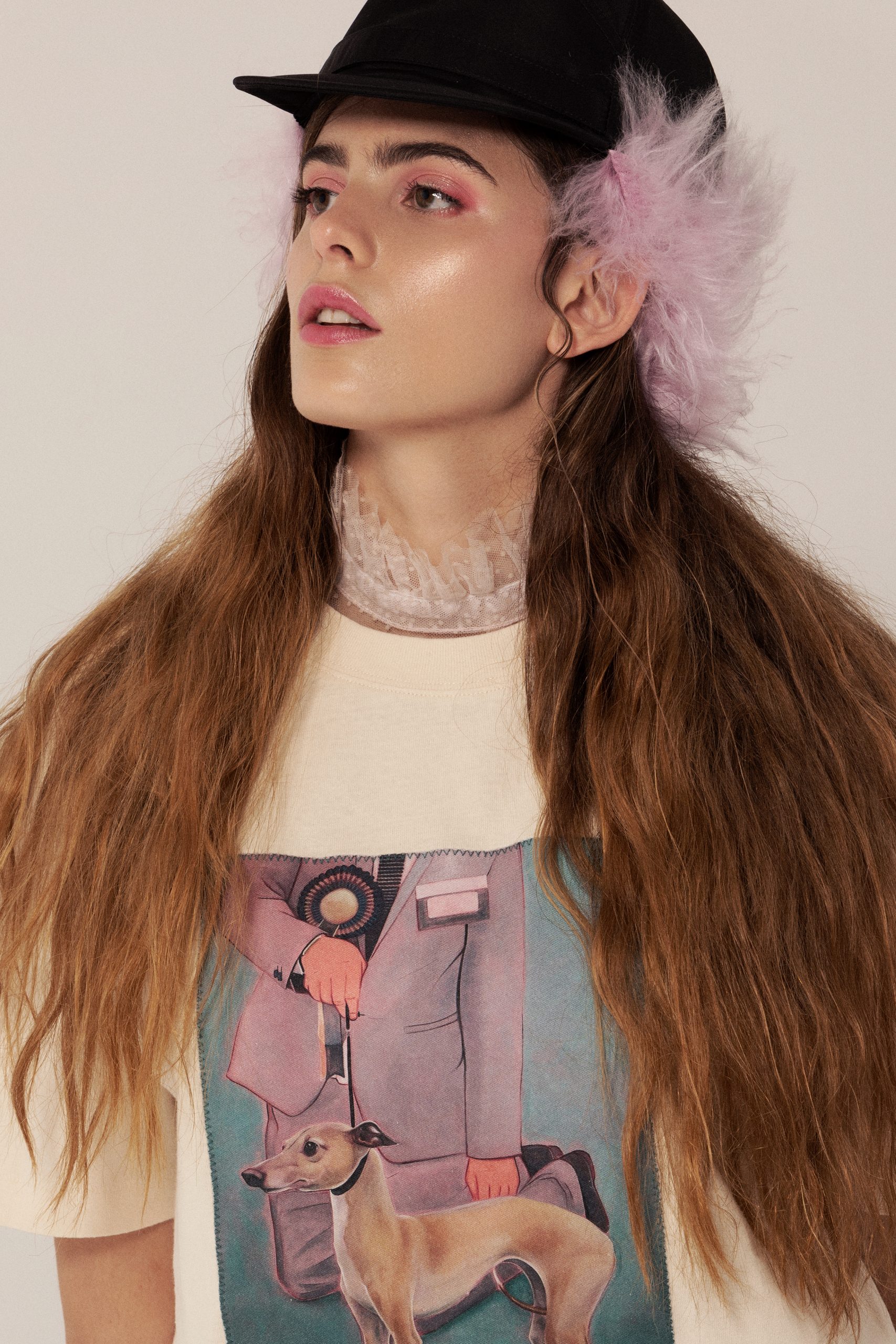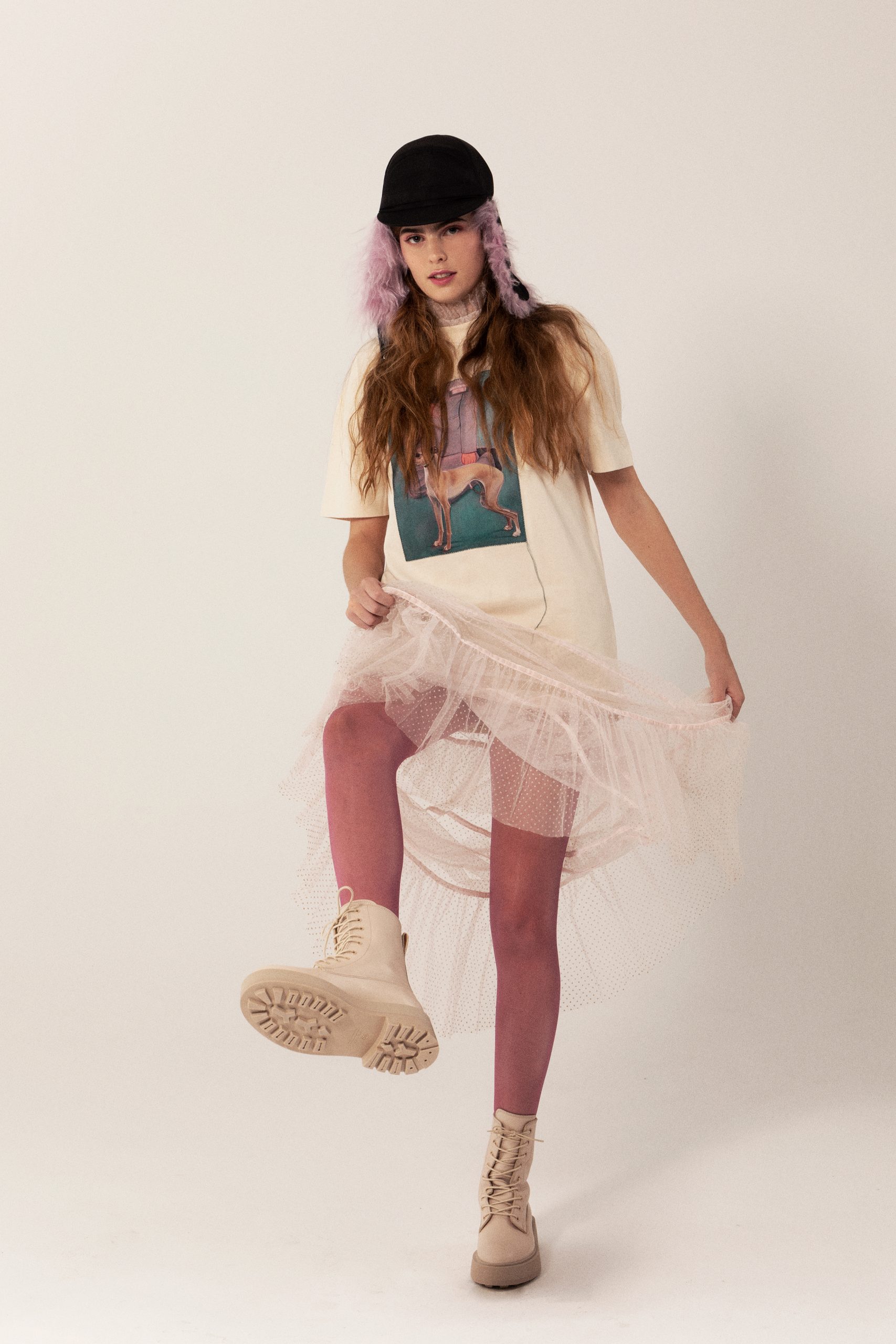 Paula; Cap: Prada; Top: ACNE Studios; Dress: Corina Plus Irina; Pantyhose: Cecilia de Rafael; Boots: & Others Stories