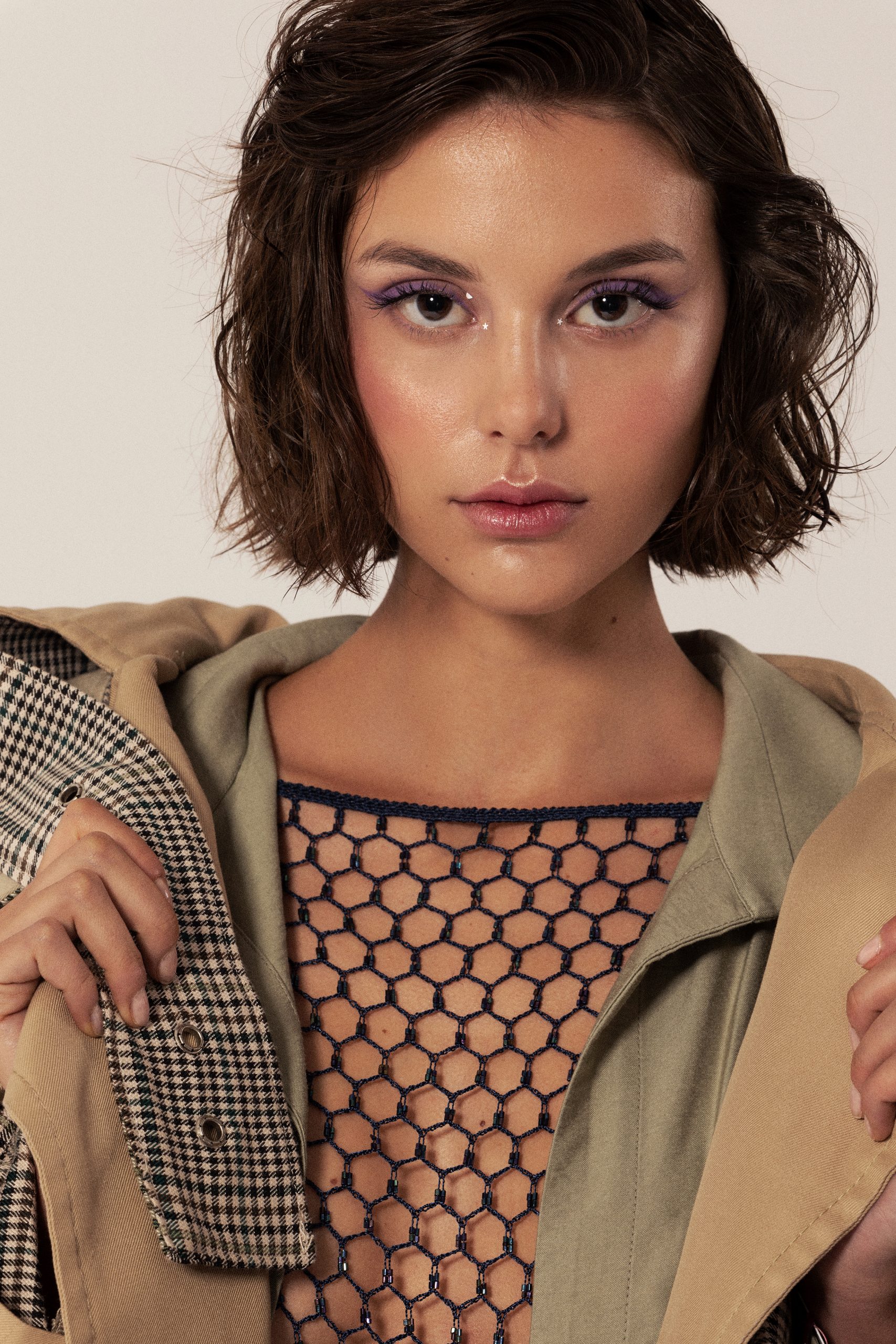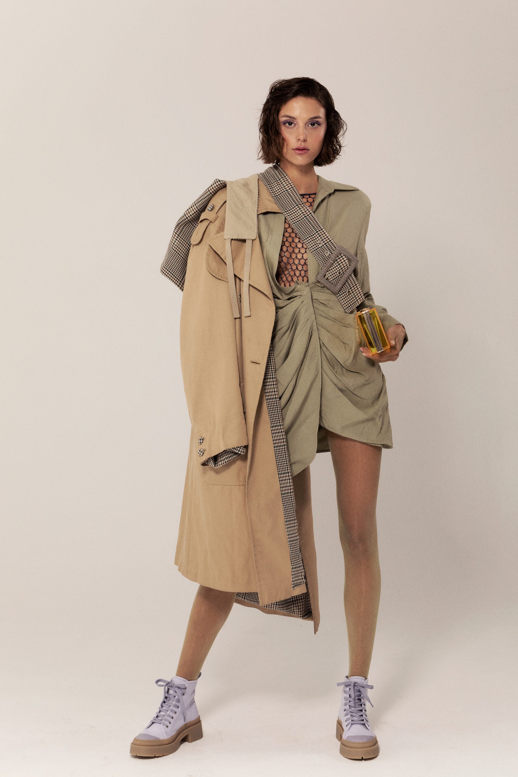 Miranda; Trench coat: Alvaro Mars; Dress: Jacquemus; Top: Roberto Cavalli; Pantyhose: Cecilia de Rafael; Boots: & Others Stories