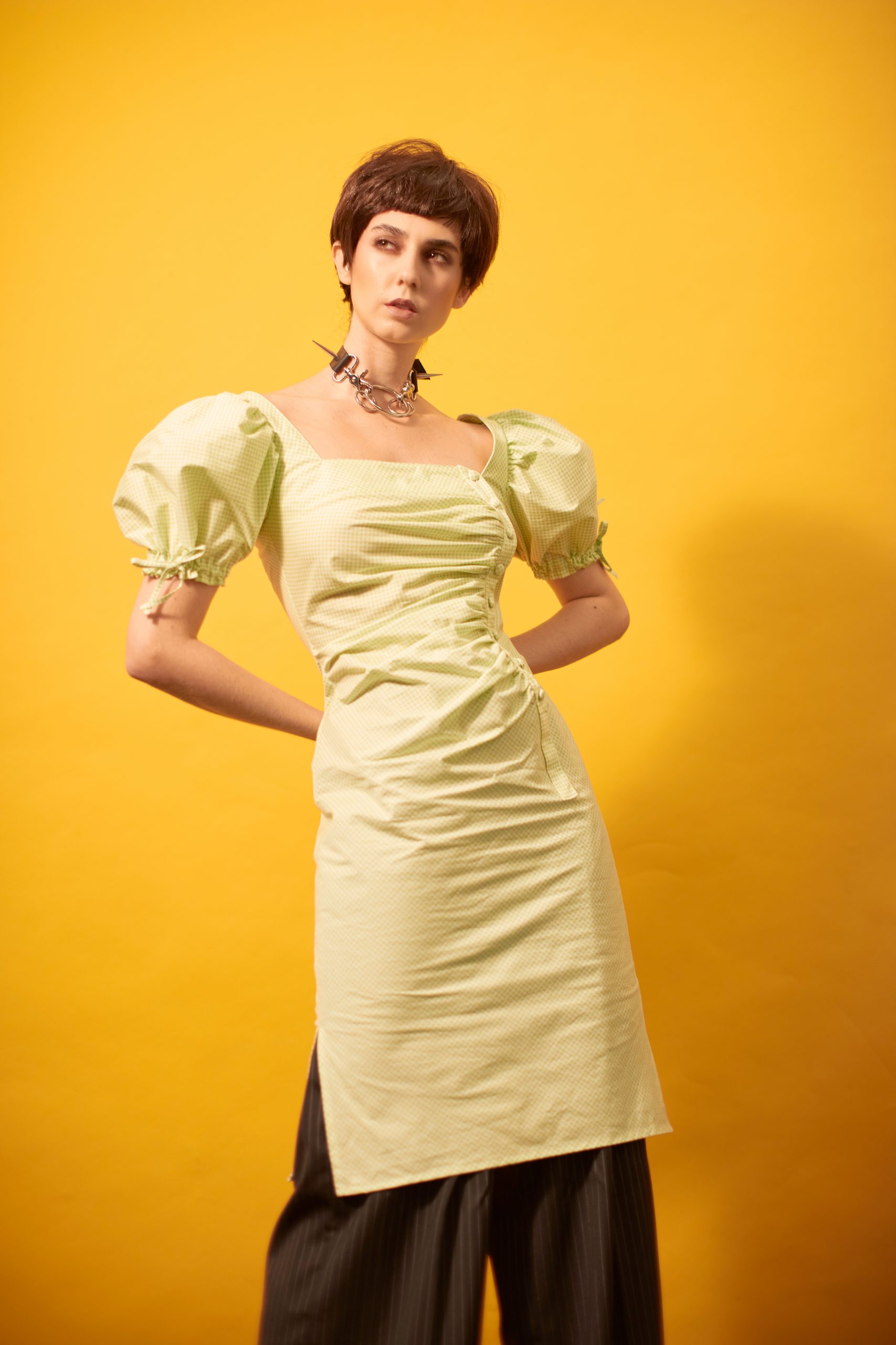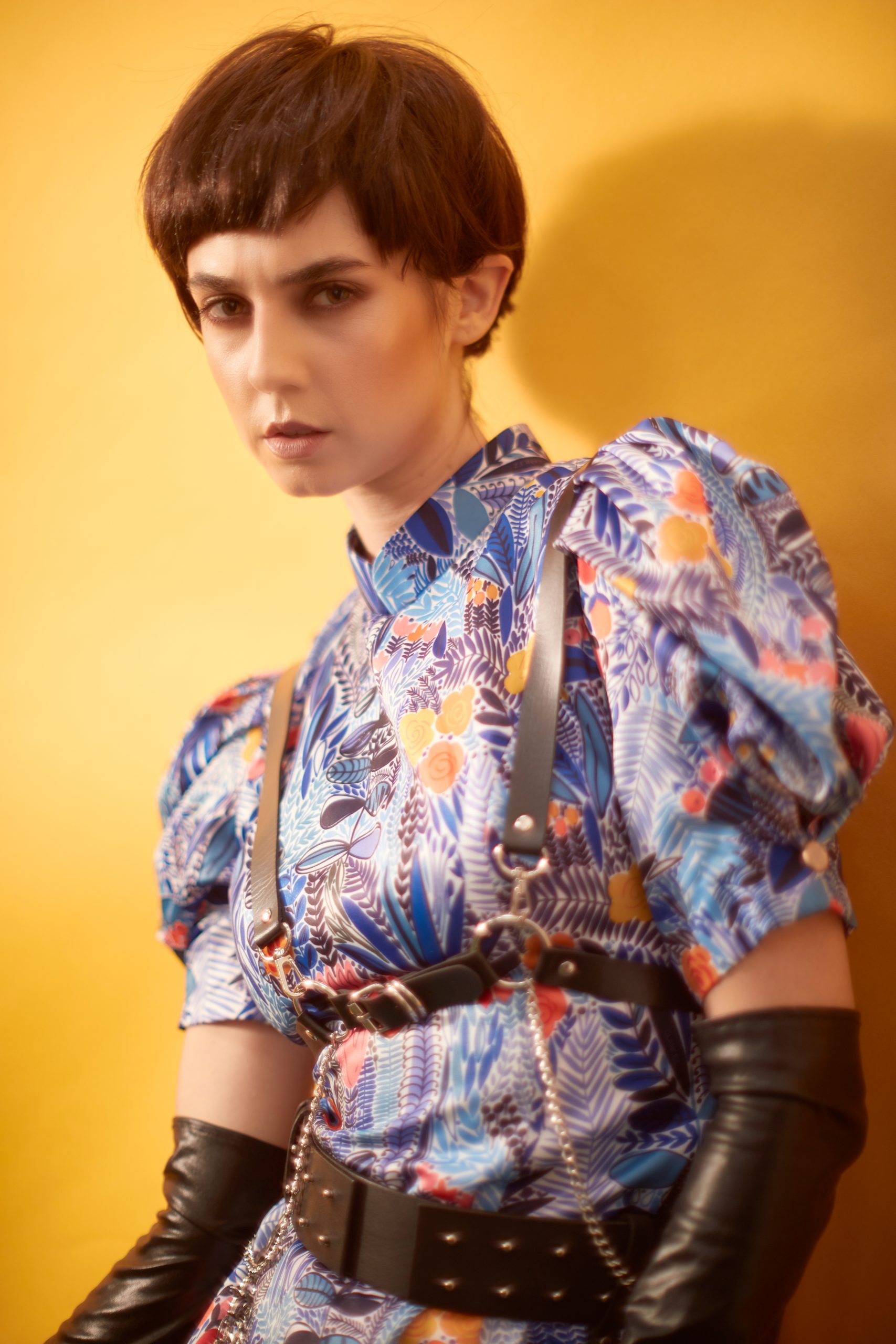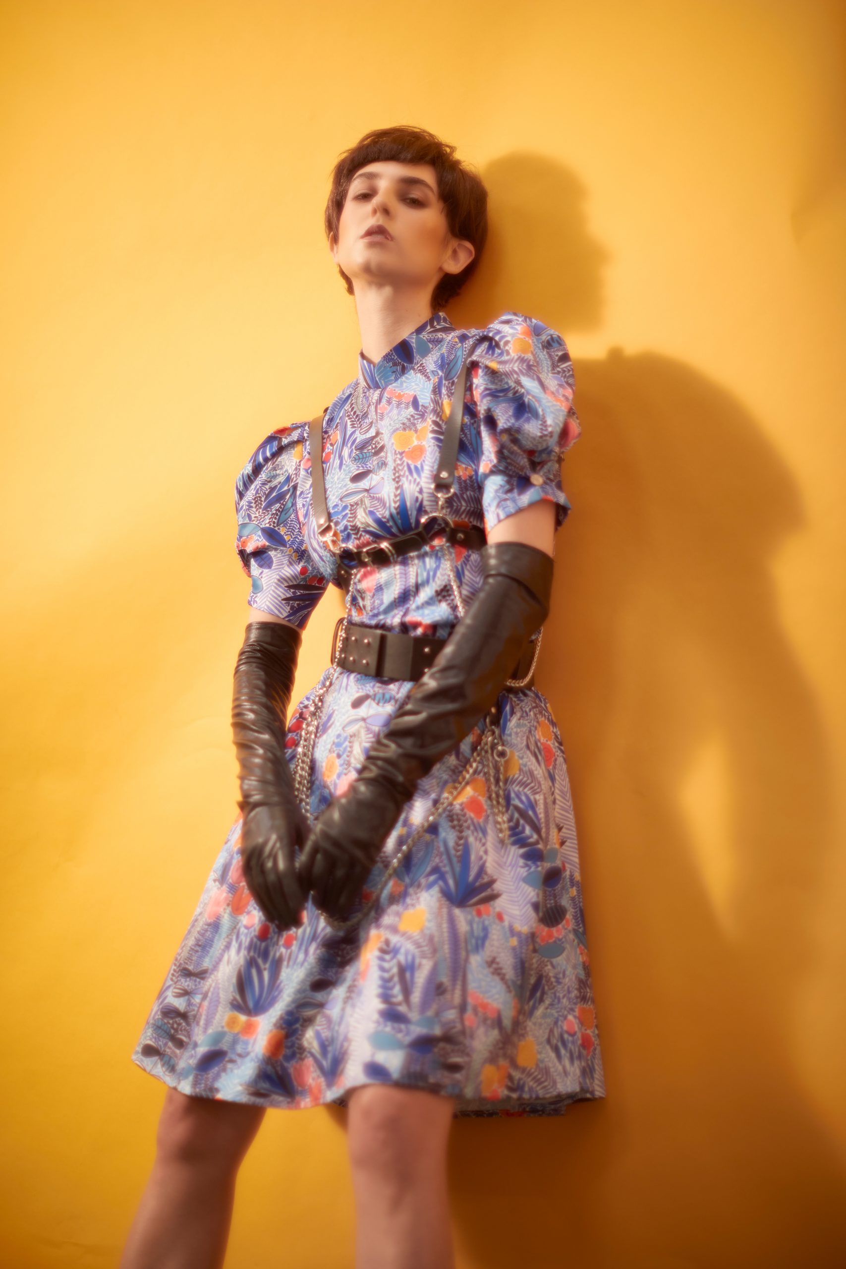 Sophie Puff Sleeves Cheongsam dress, Glancez (@glancez), harness and belt, Hauxse by Han David (@hauxse), boots, Versace (@versace), gloves, stylist’s own.