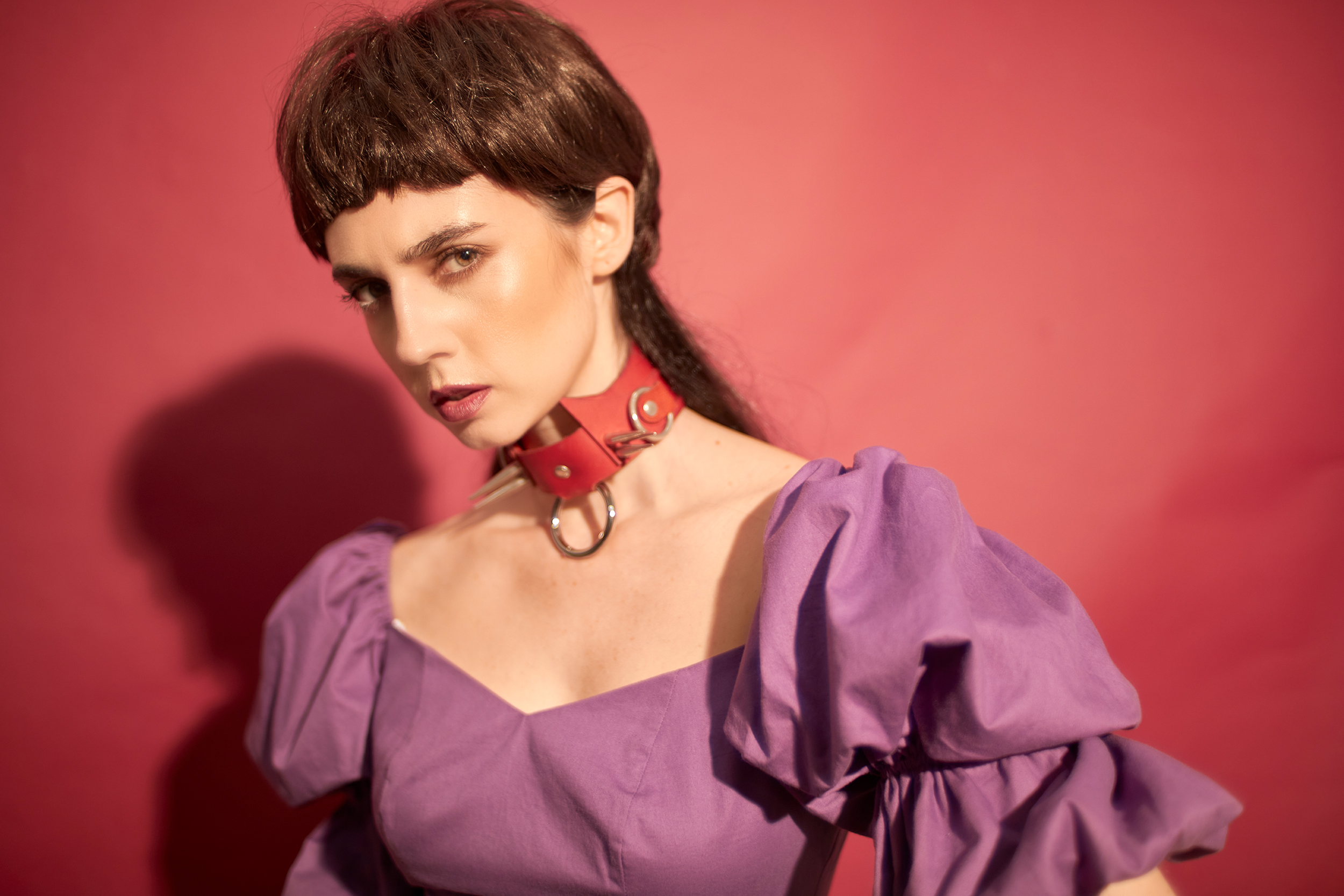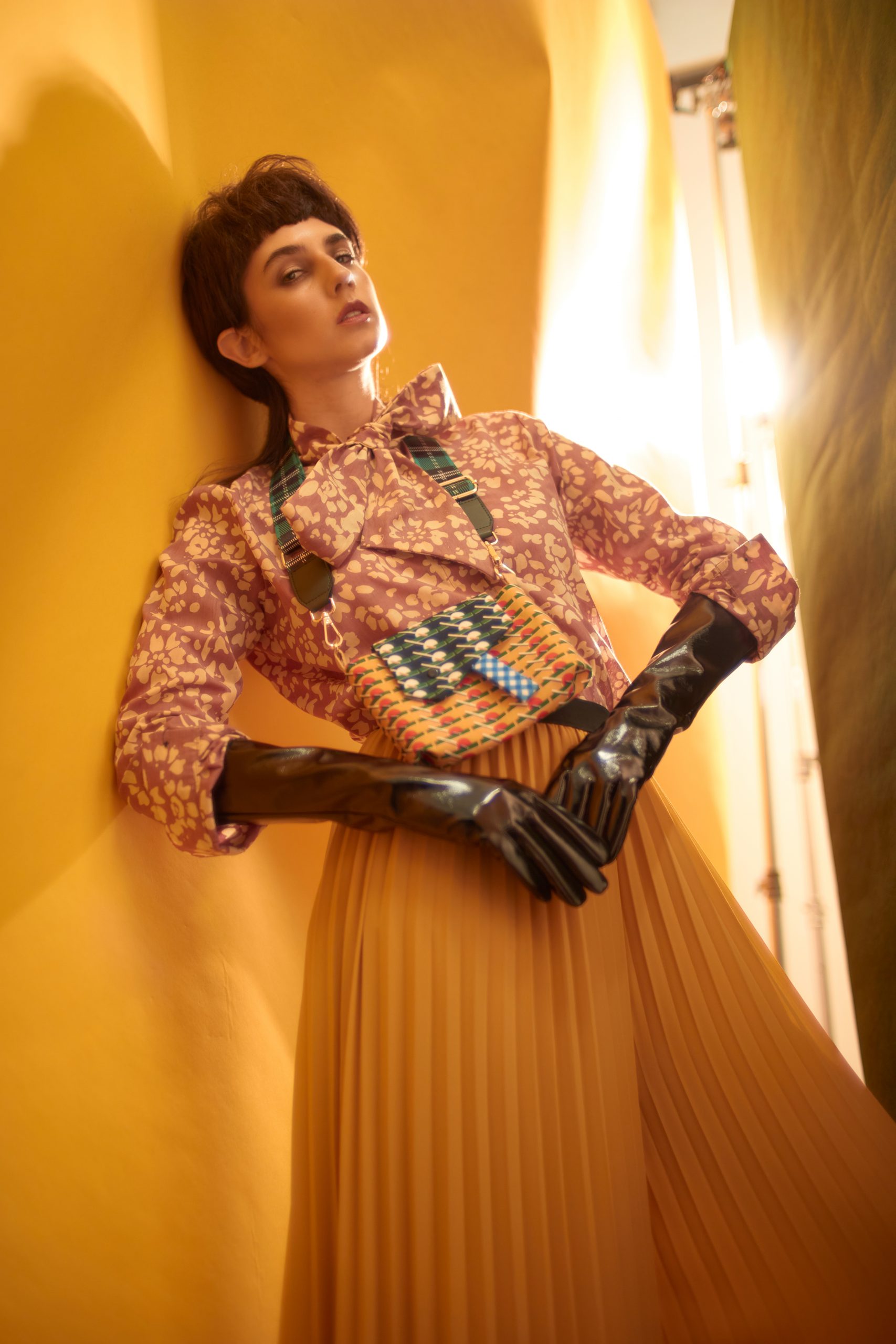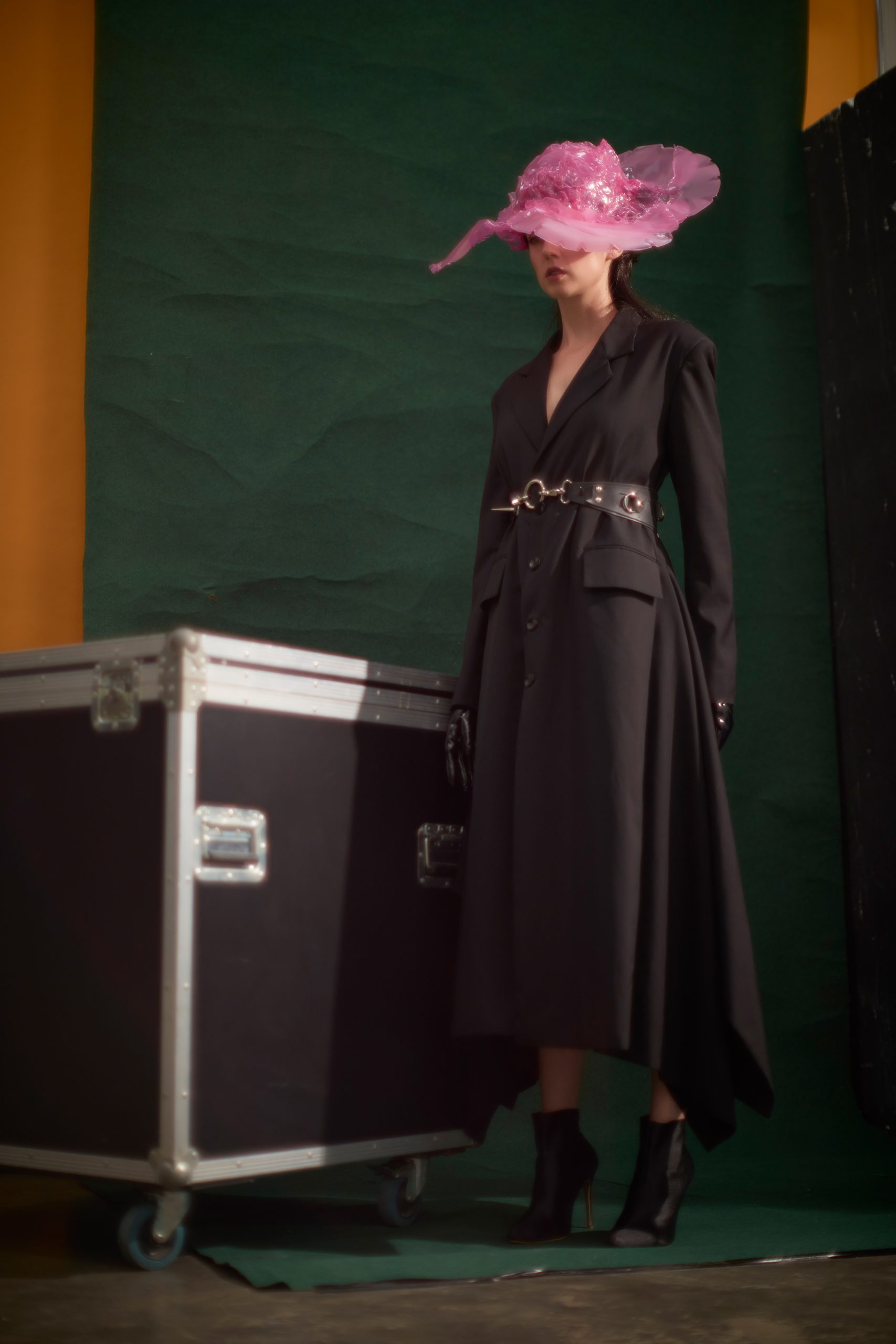 Sophie Puff Sleeves Cheongsam dress, Glancez (@glancez), harness and belt, Hauxse by Han David (@hauxse), boots, Versace (@versace), gloves, stylist’s own.