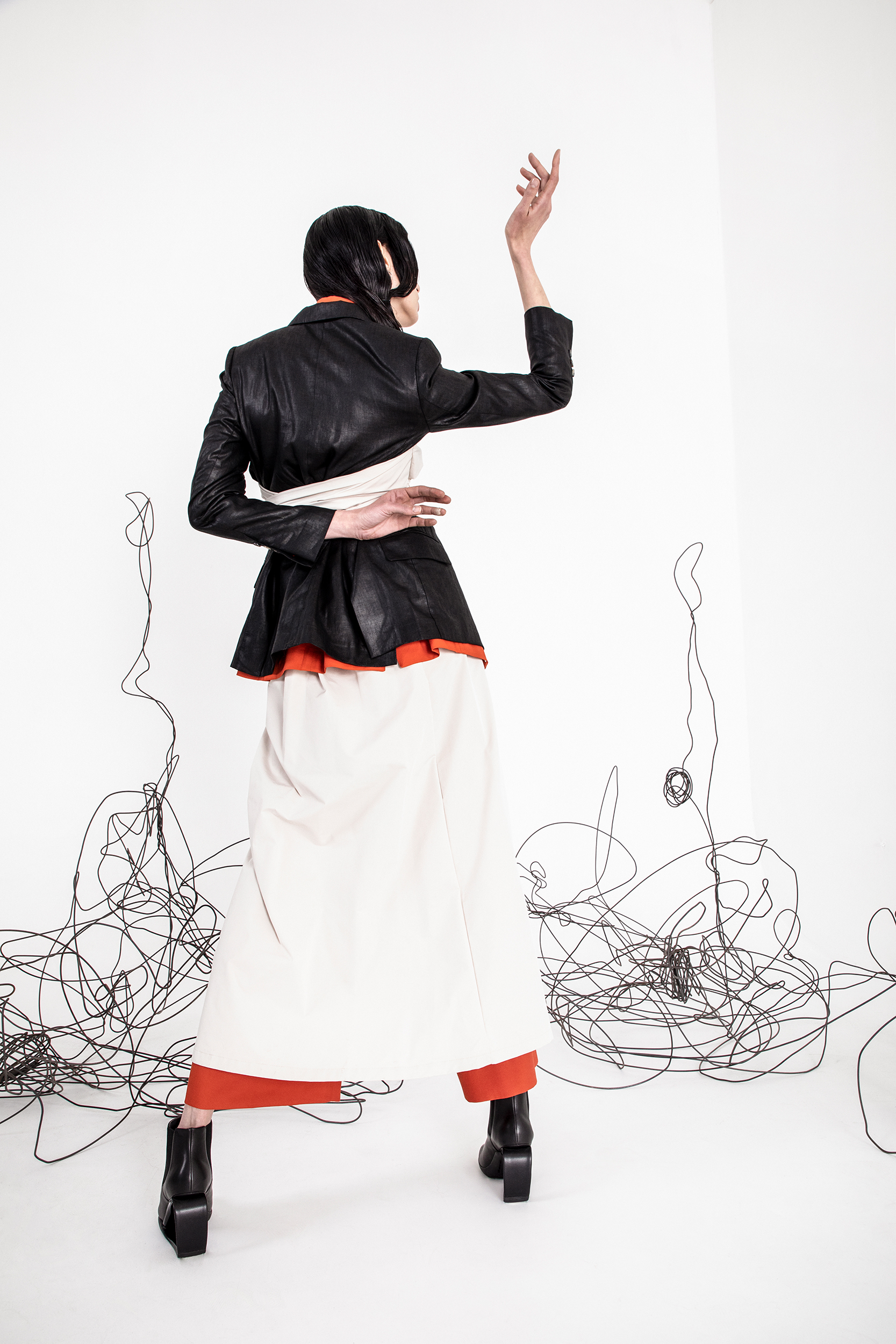 Black jacket, orange Blazer and pants Tela @tela9official skirt and beige top Weili Zheng @weili_zheng shoes United nude @unitednude