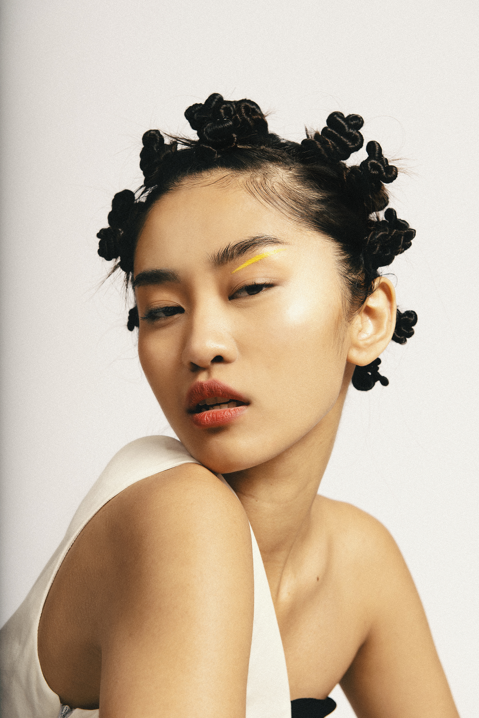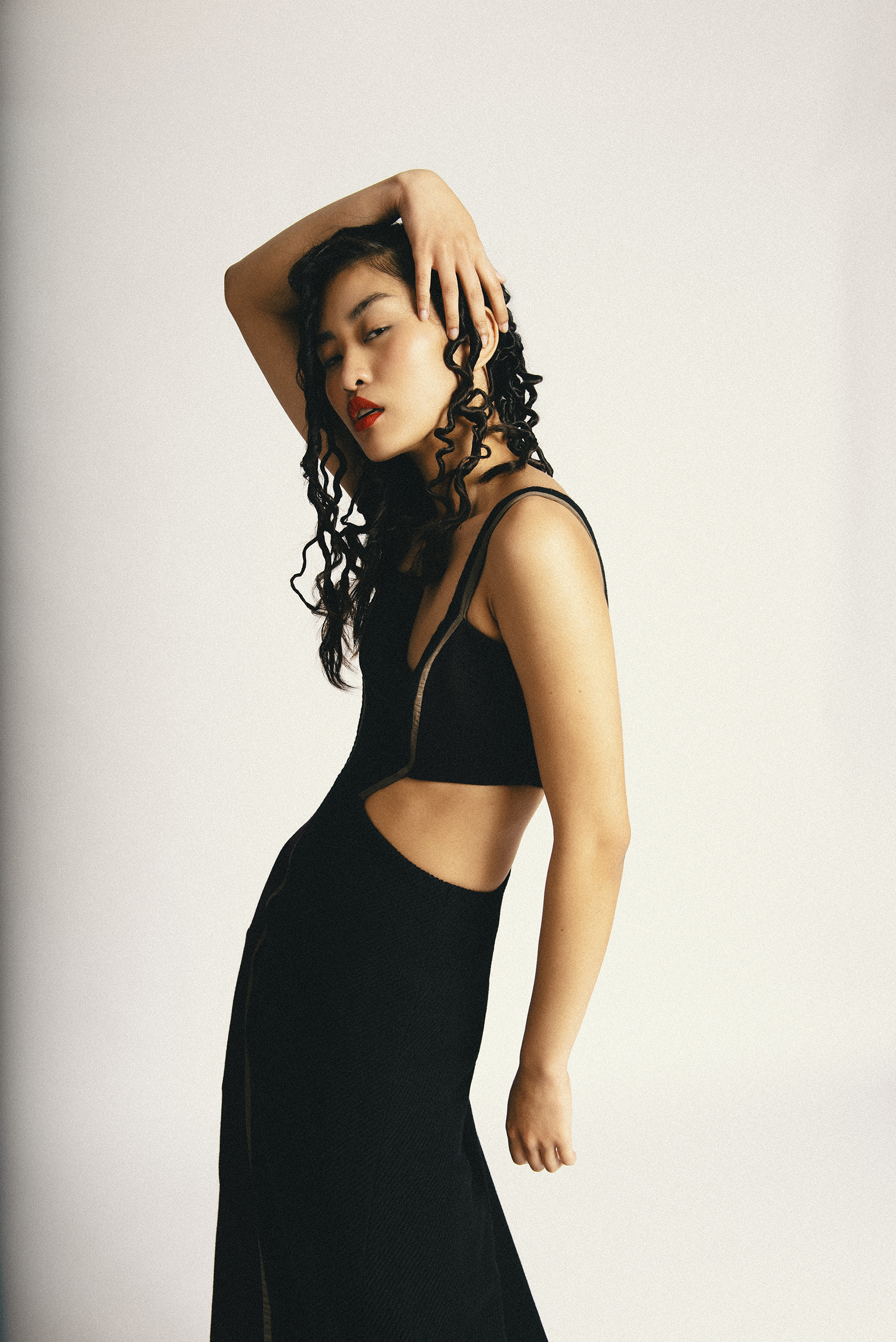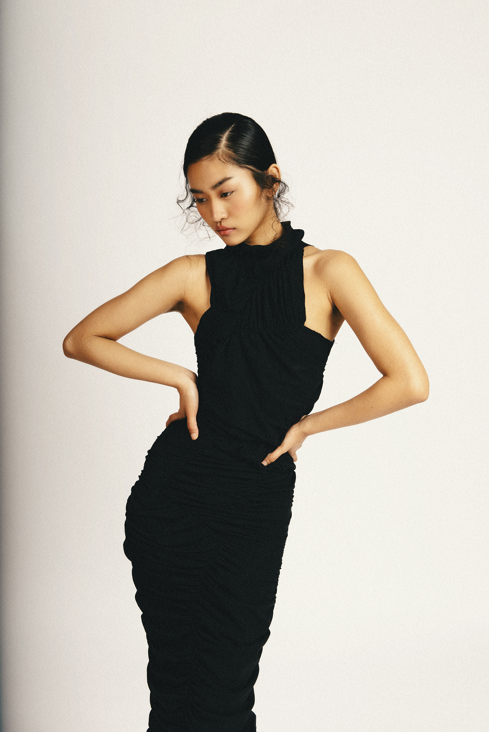 This editorial followed by a dark clothes, full of contrasts with the white scene of the frame and different perspectives gives us such a powerful and striking editorial. The model Hillary with a very special charisma in front of the camera, transports the viewer to a her dark side, her alter ego.