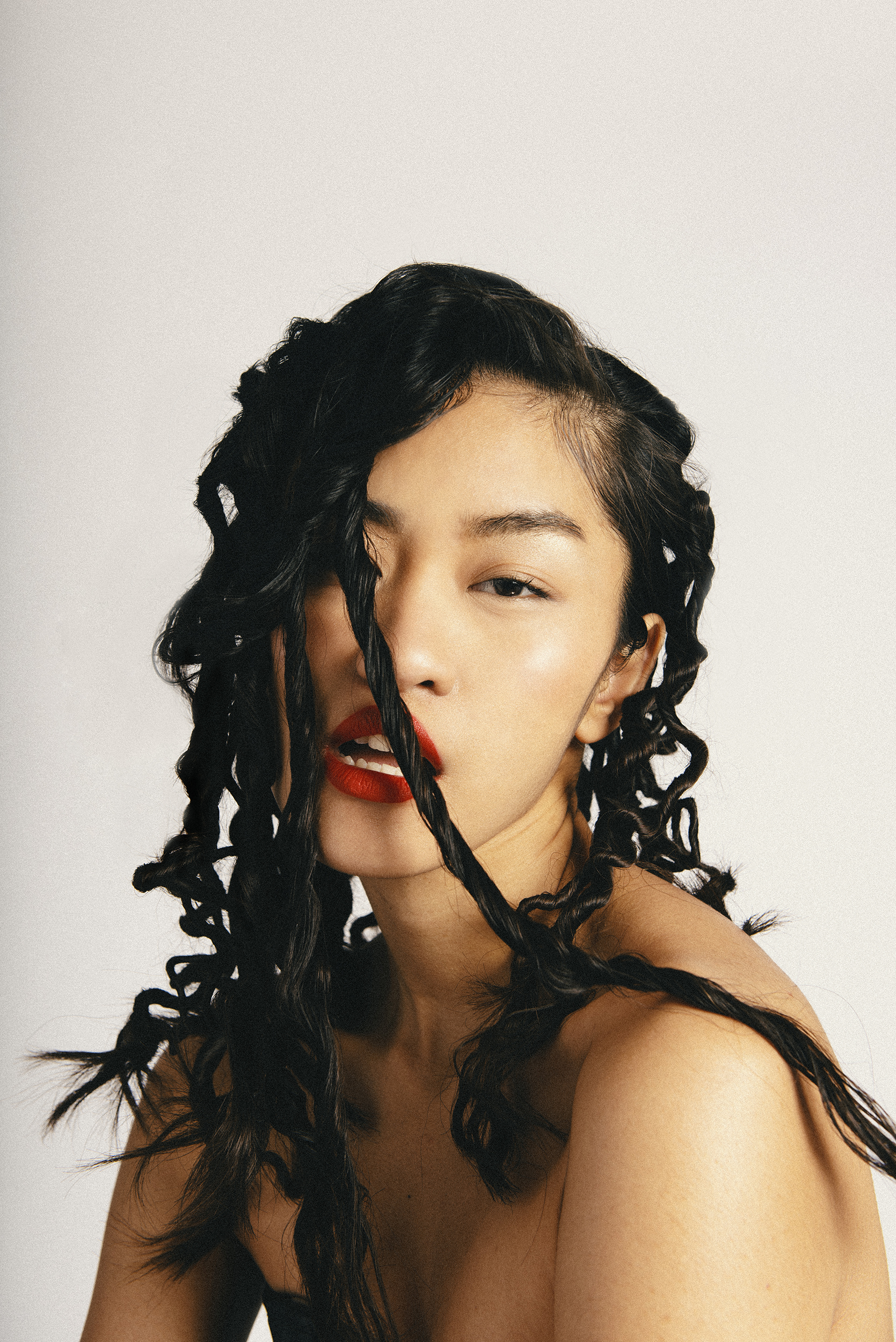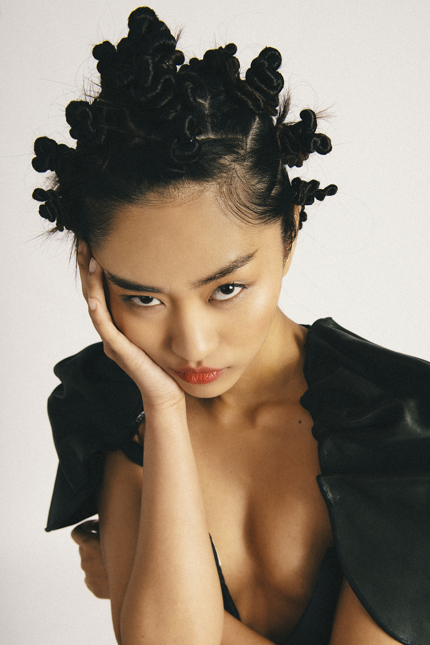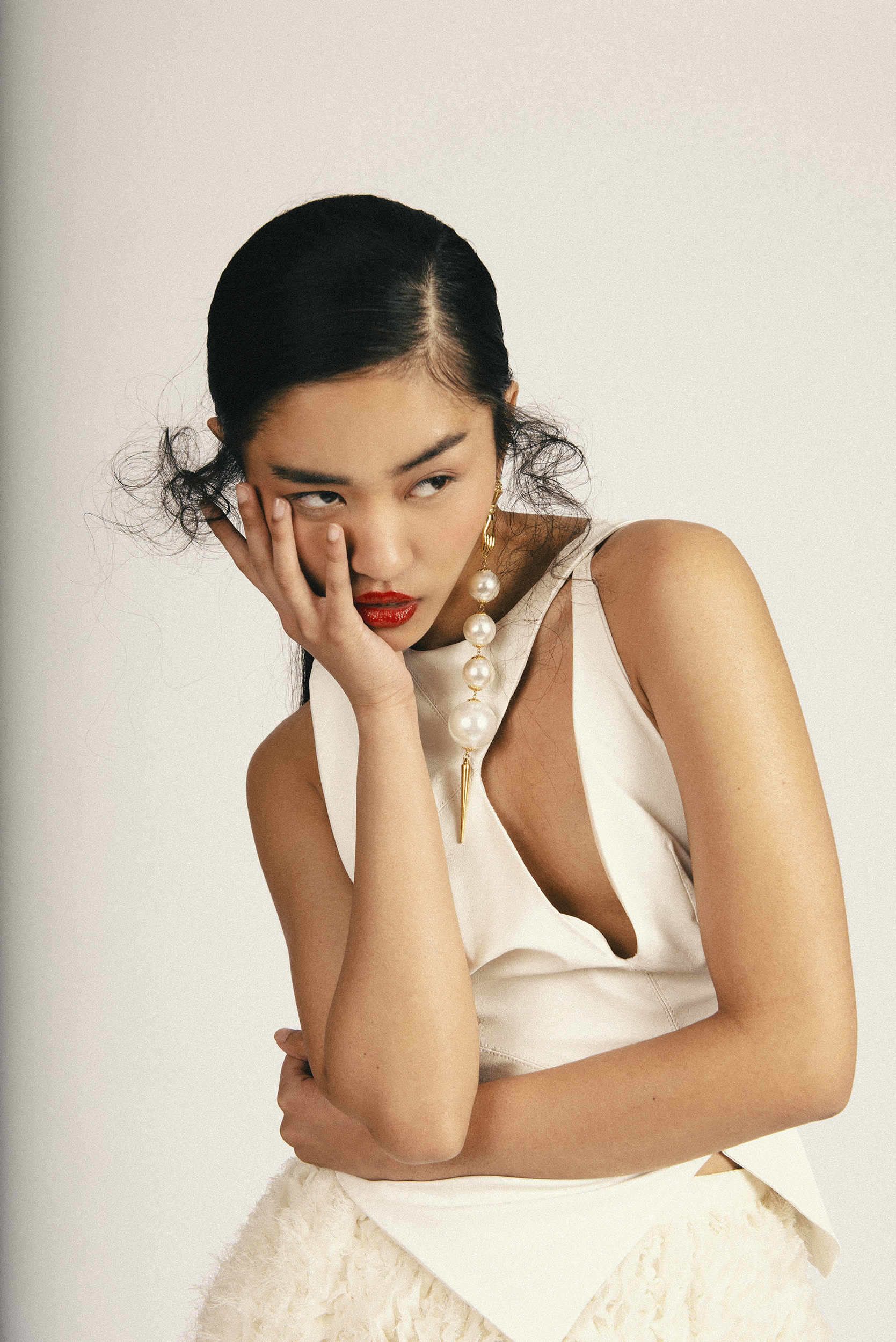 This editorial followed by a dark clothes, full of contrasts with the white scene of the frame and different perspectives gives us such a powerful and striking editorial. The model Hillary with a very special charisma in front of the camera, transports the viewer to a her dark side, her alter ego.