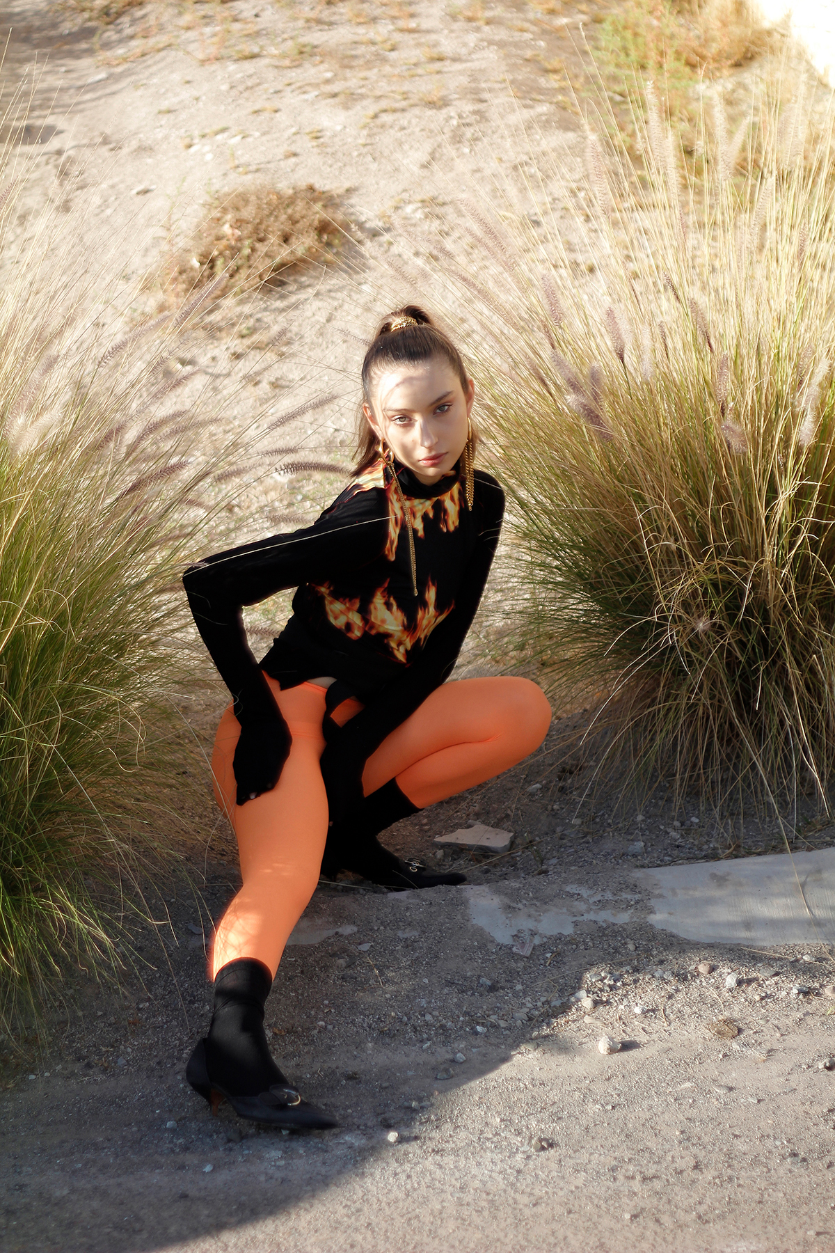 R.A.C. MX Turtleneck, Tights (Model’s own), MUUD Earrings and Chains, PRADA Heels.