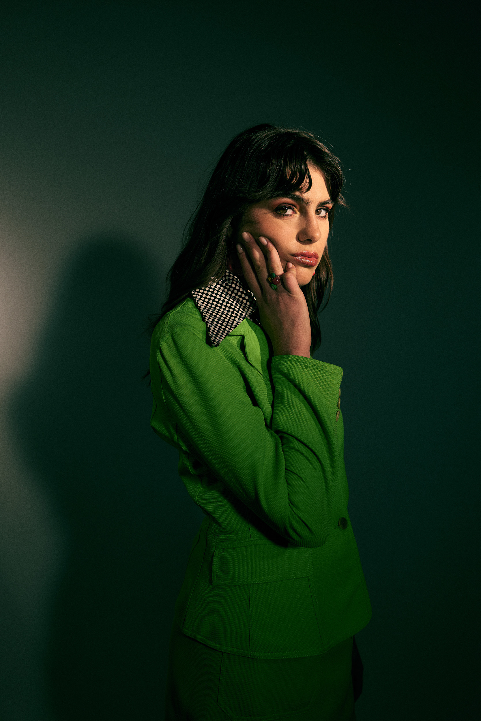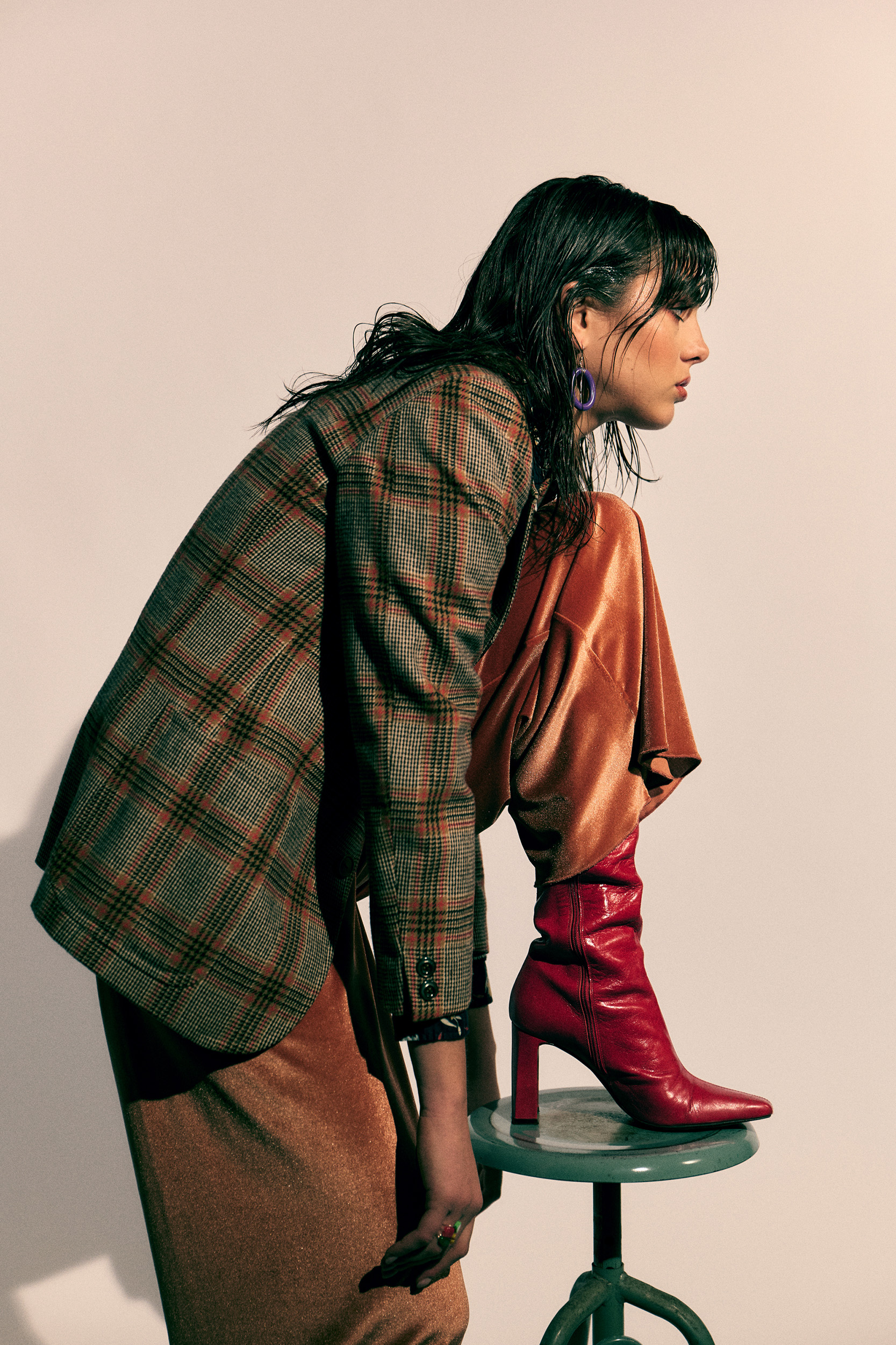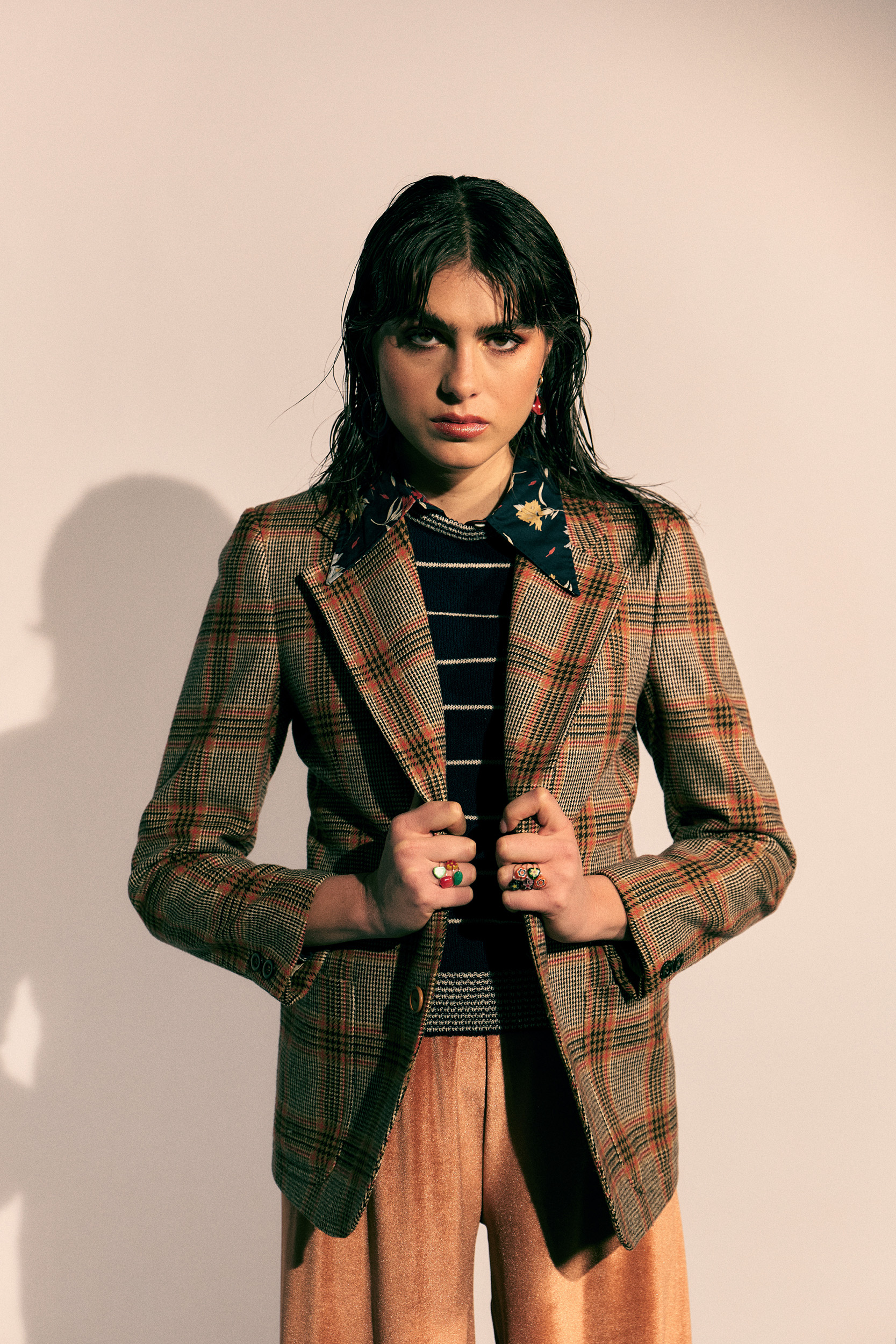 jacket & sweater: vintage stylist’s archive; shirt: Cacharel; trouser: Moqรจtte; jewelry: Room; boots: Zara