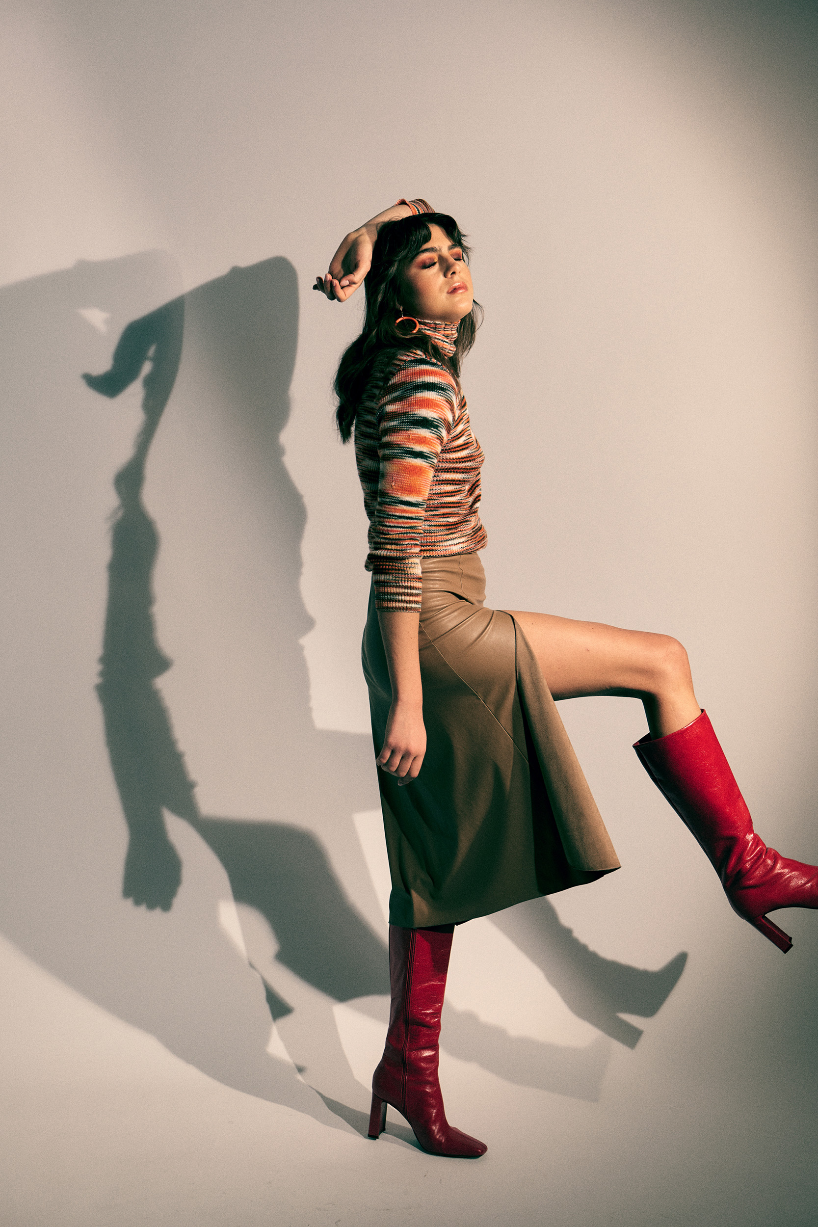 sweater: vintage stylist’s archive; skit: Moqรจtte; jewelry: Room; boots: Zara