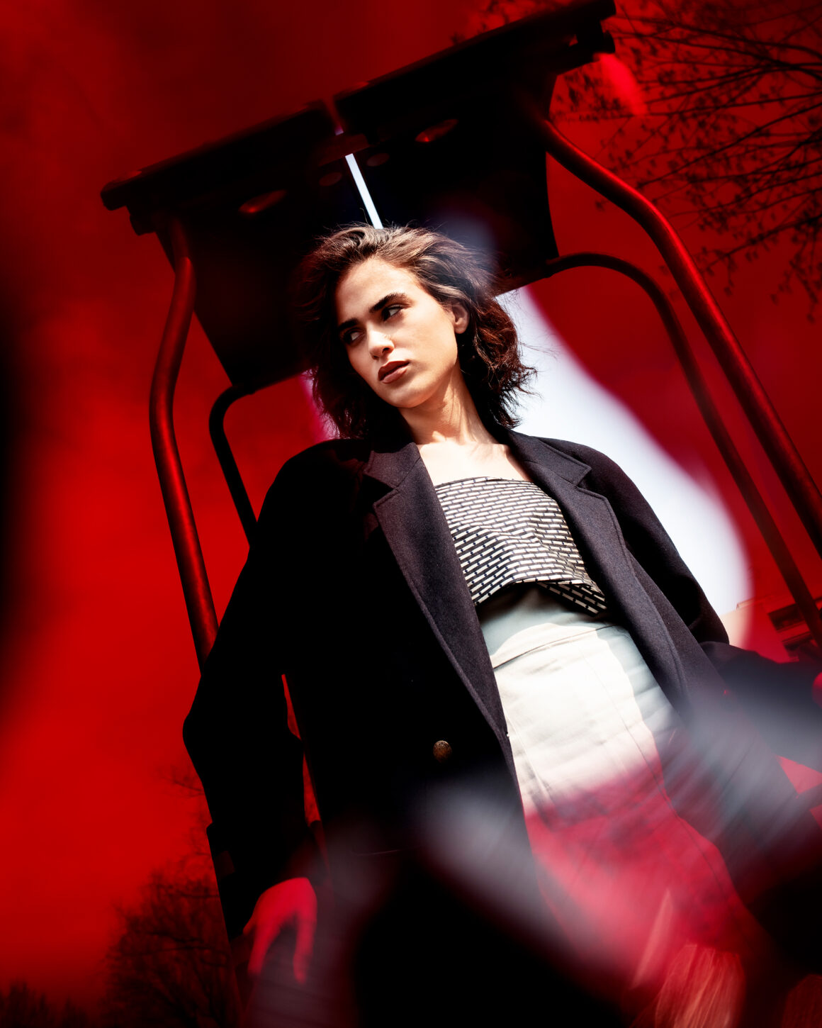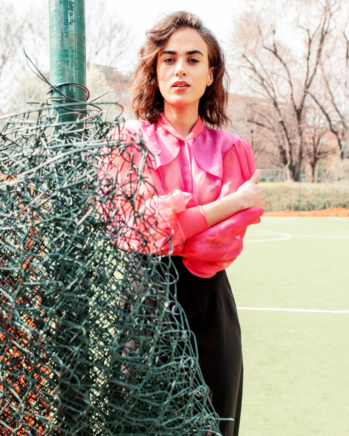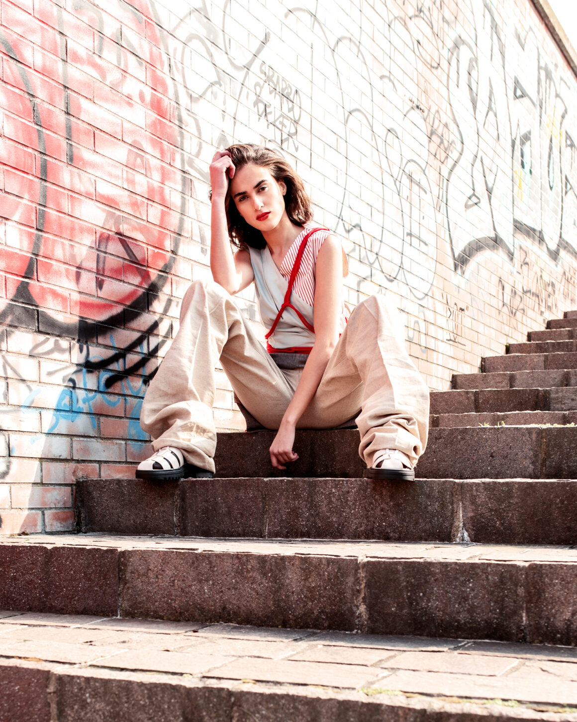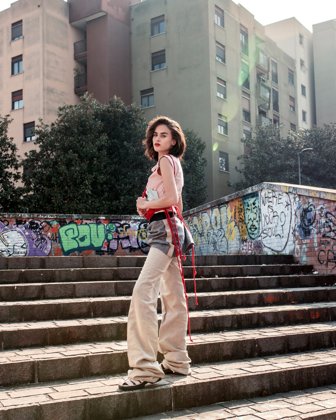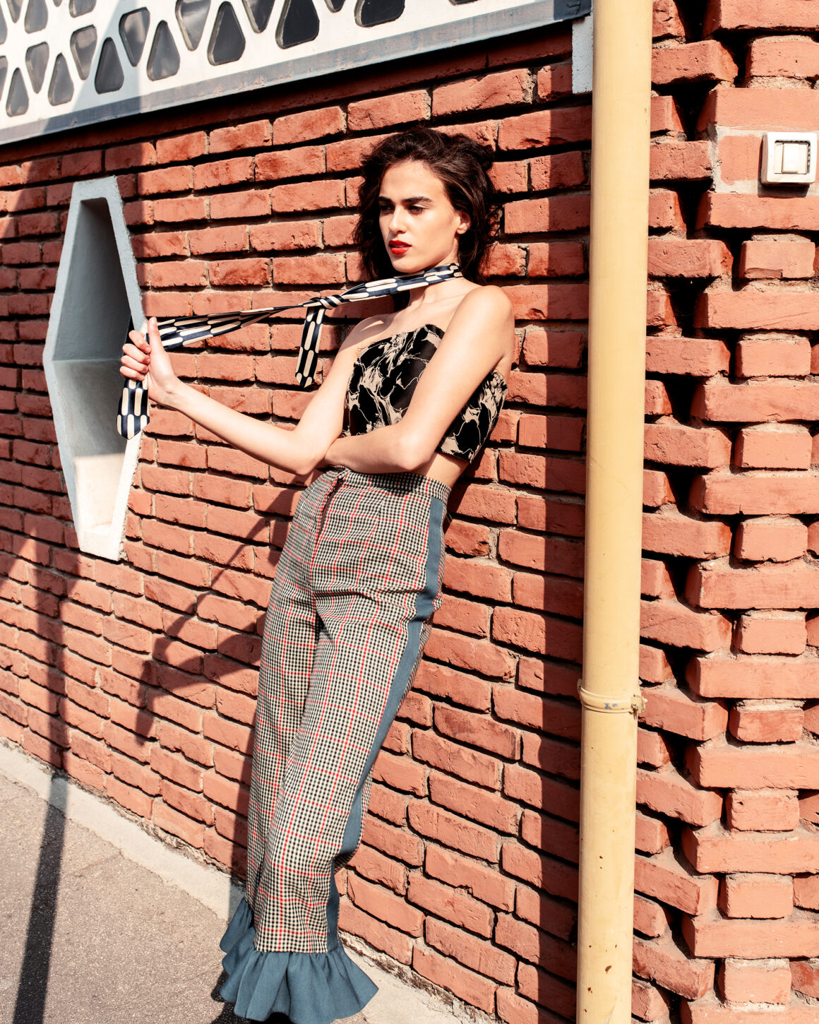 Top by stylist archive, pants by designer Elisa Martellotta, vintage necktie by Nino Salzano, shoes by Emma Hope